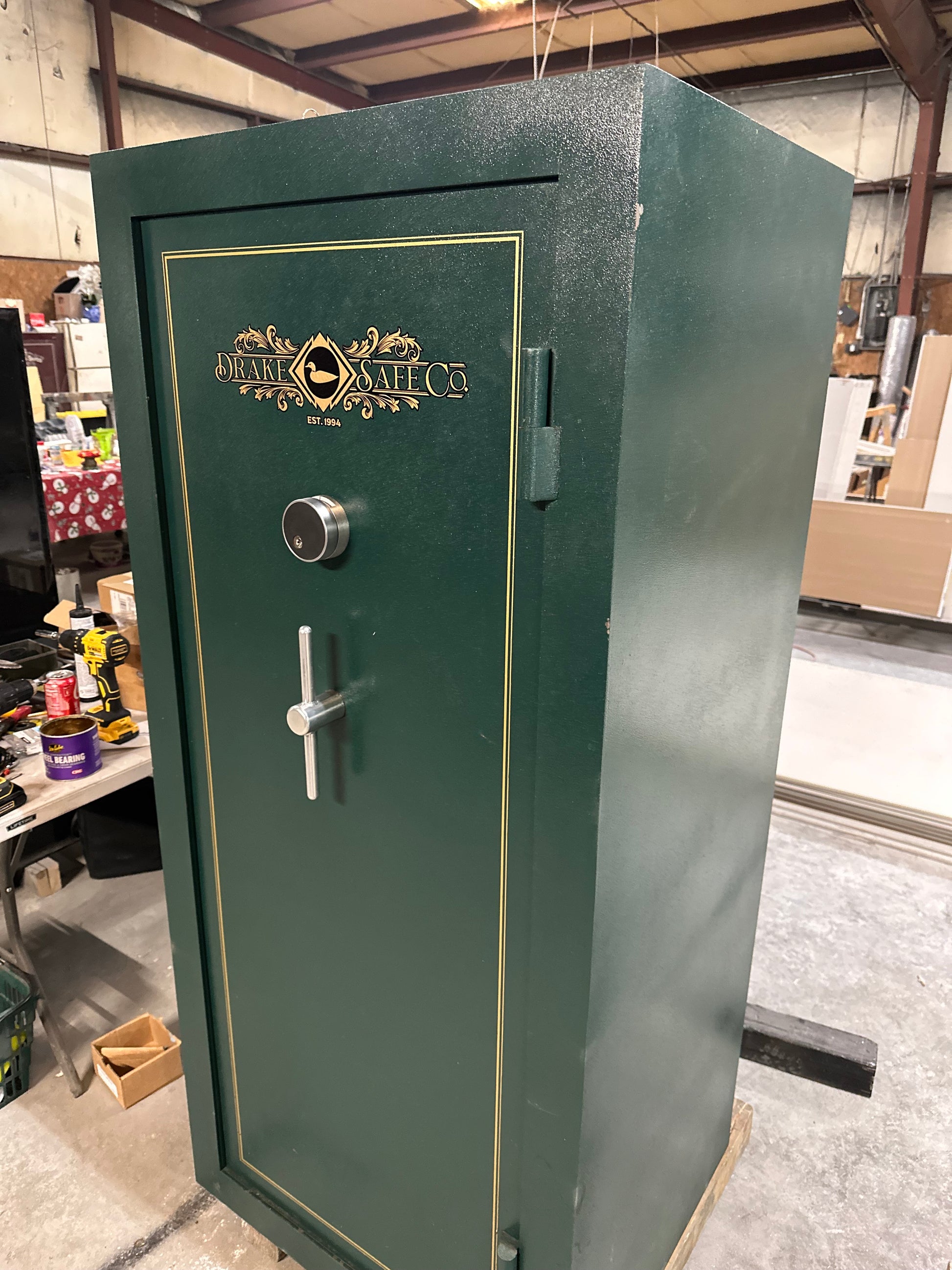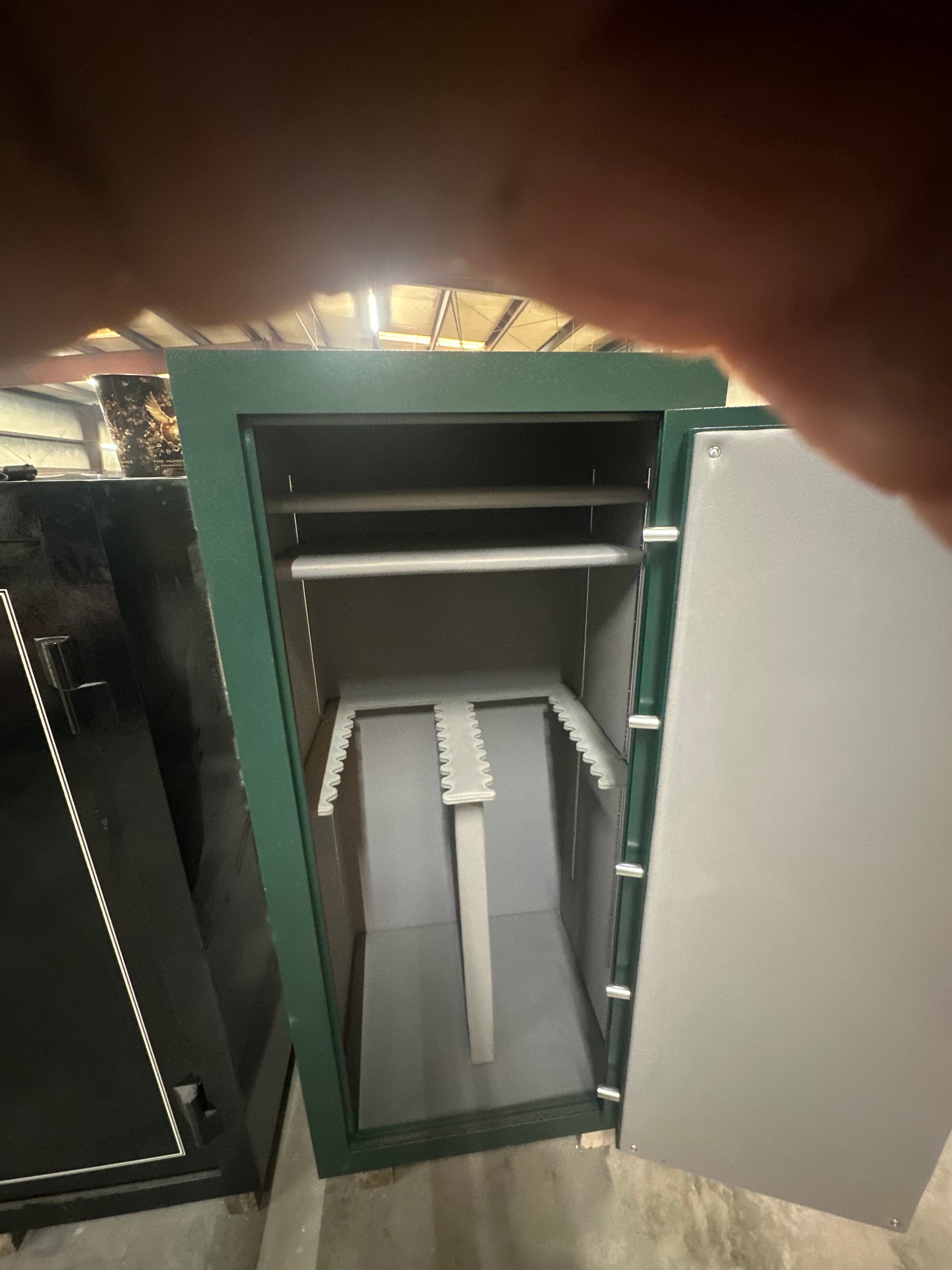 Crafted from robust 1/4-inch thick steel, weighing a mighty 1050 pounds, and fortified with 5/8 fireboard, the DS-18U ensures superior fire resistance, enduring temperatures up to 1330 degrees for 30 minutes. Measuring 65 3/4" tall x 29 3/4" wide x 25 1/4" deep, the DS-18U offers three interior options, including two side shelf options with 9 or 18 long-guns, or an all-gun interior that accommodates up to 36 long guns. This safe features two adjustable top storage shelves.