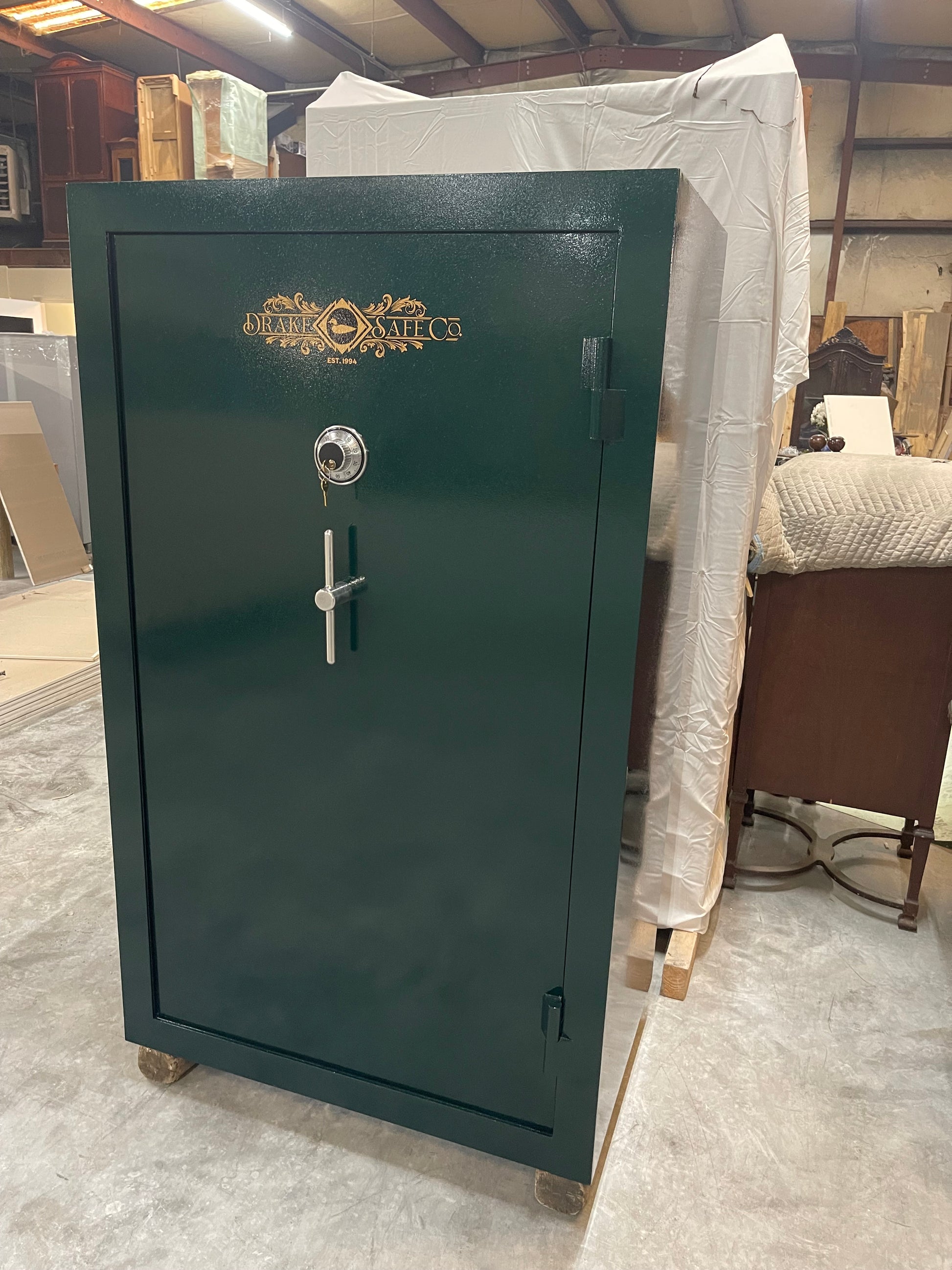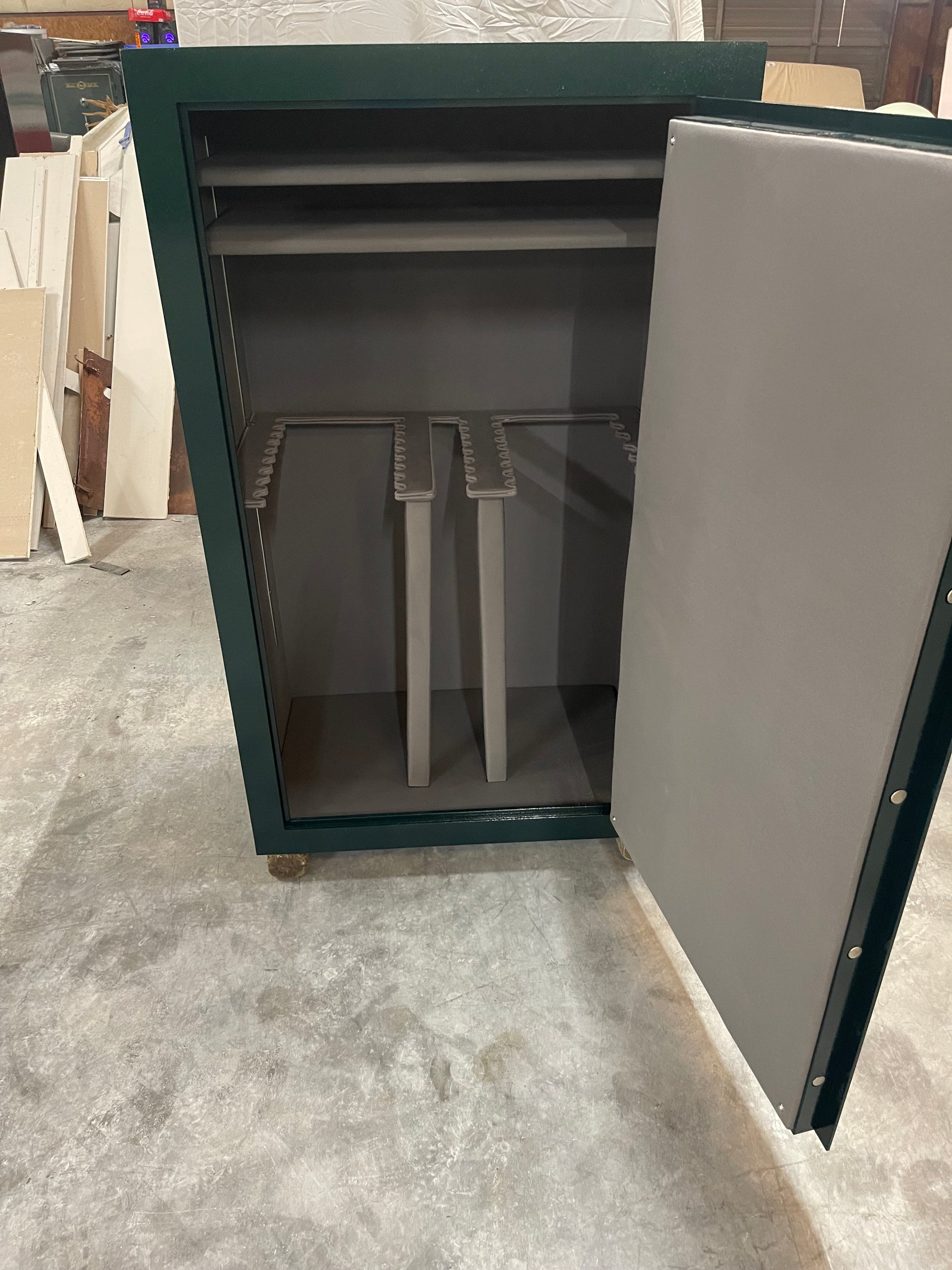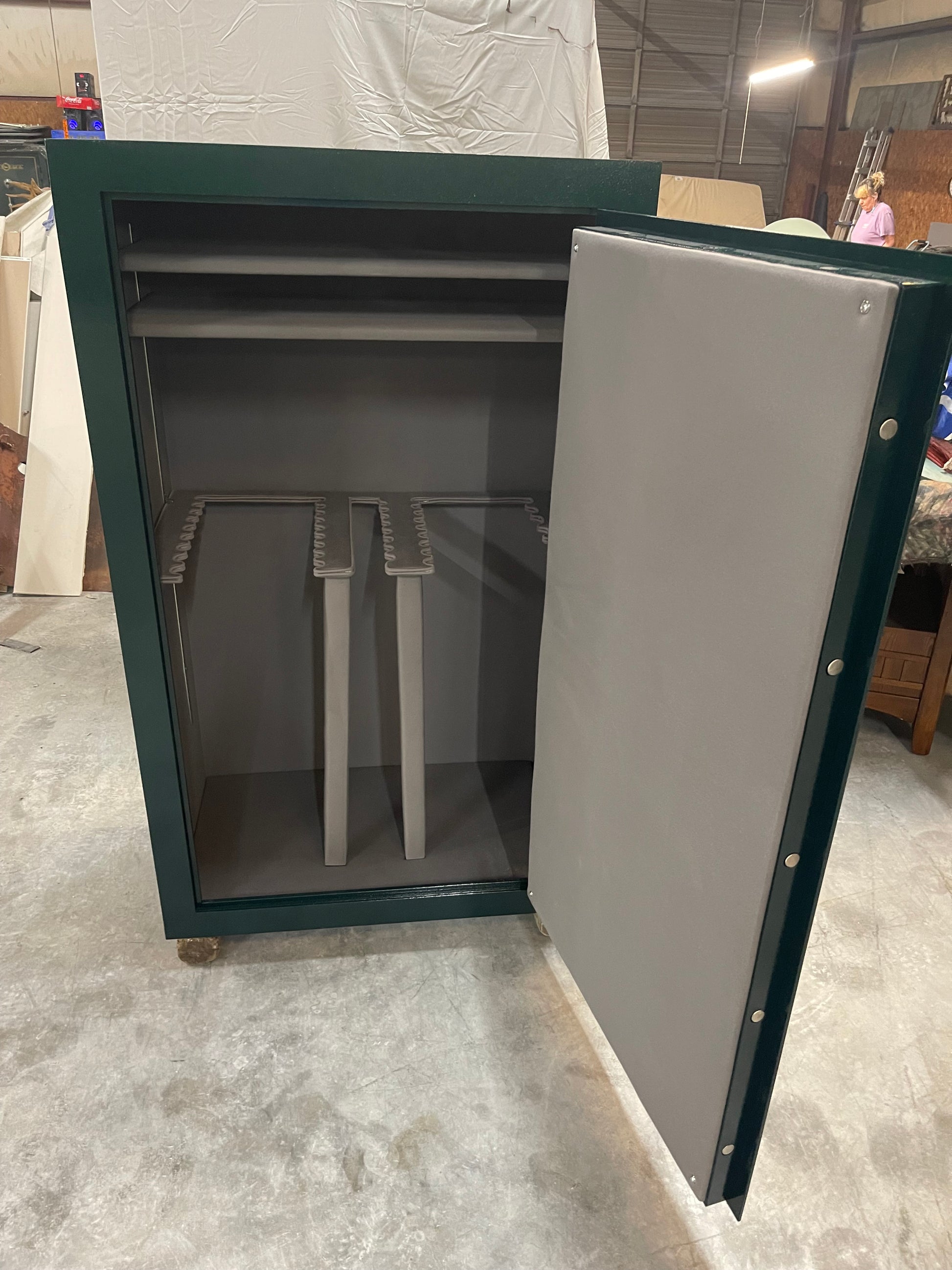 Crafted from robust 1/4-inch thick steel, weighing a mighty 1250 pounds, and fortified with 5/8 fireboard, the DS-36U ensures superior fire resistance, enduring temperatures up to 1330 degrees for 30 minutes. Measuring 65 3/4" tall x 35 3/4" wide x 25 1/4" deep, the DS-36U offers four interior options, including three side shelf options with 9,18, and 27 long-guns, or an all-gun interior that accommodates up to 36 long guns. This safe features two adjustable top storage shelves.