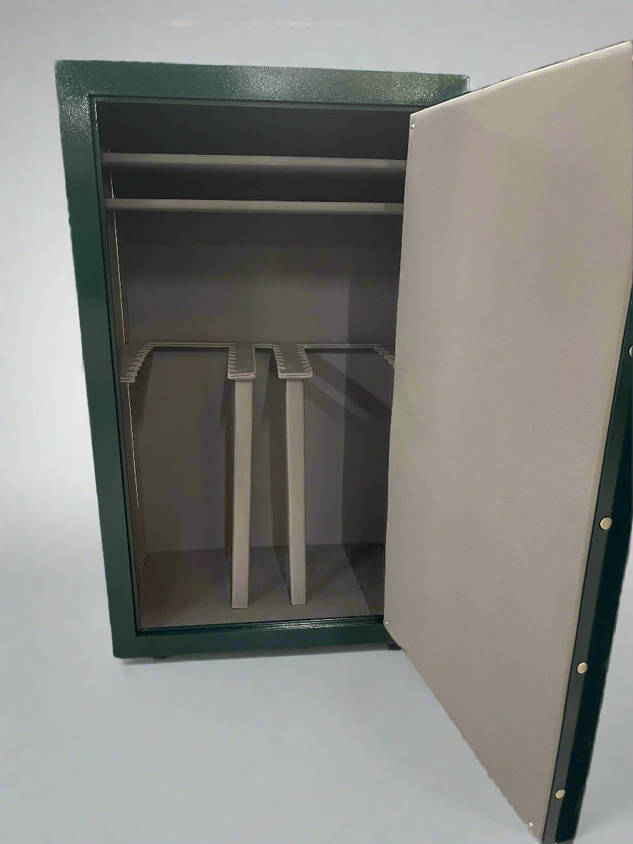 Crafted from robust 1/4-inch thick steel, weighing a mighty 1400 pounds, and fortified with 5/8 fireboard, the DS-40U ensures superior fire resistance, enduring temperatures up to 1330 degrees for 30 minutes. Measuring 65 3/4" tall x 39 3/4" wide x 25 1/4" deep, the DS-40U offers five interior options, including four side shelf options with 9,18, 27, or 36 long-guns, or an all-gun interior that accommodates up to 45 long guns. This safe features two adjustable top storage shelves.